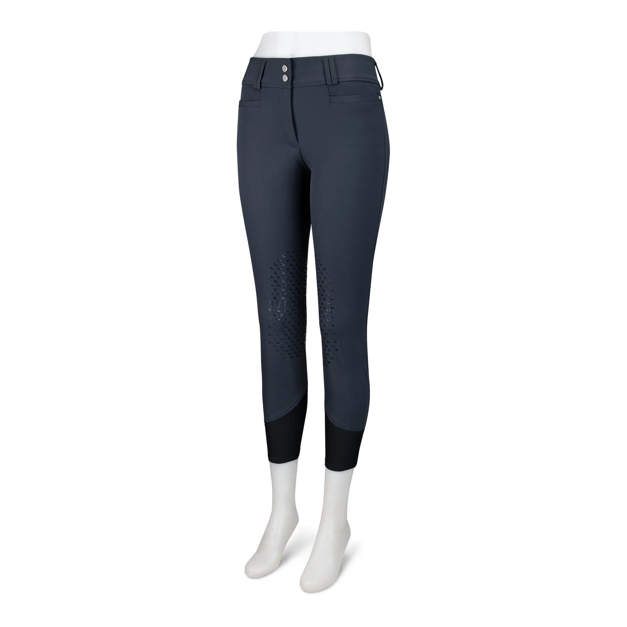 Our Harper breech offers the same fit and comfort of our bestselling Gulf breech, but with some unique updates. The natural rise, front zip euro seat breech features silicone knee patches for ultimate comfort and performance. The premium quick dry and stretch fabric provides amazing hand-feel, sculpt and coverage. The fabric covered interior waistband and mesh lower leg panels provide a clean and comfortable fit. Updated pocket design and logo rivets complete the design.